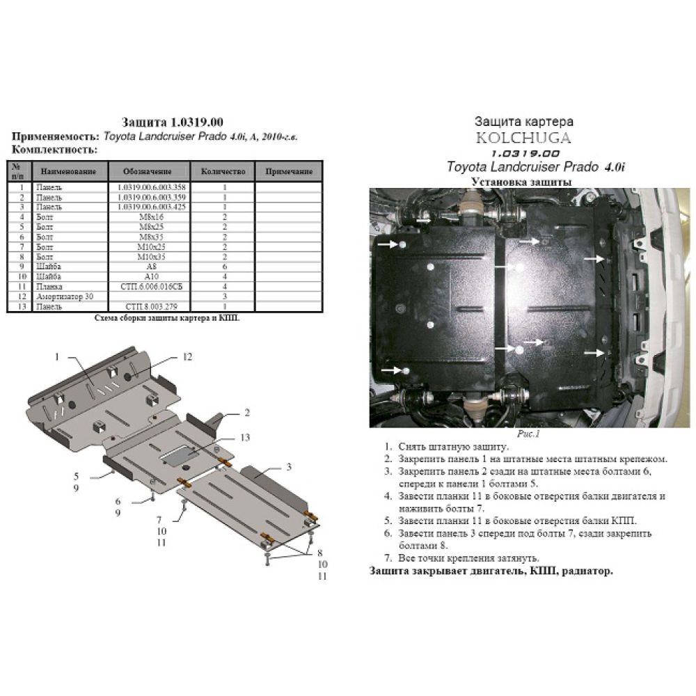 Защита моторного отсека для Toyota LC 150 Prado '10-, V-4,0, от Украинского производителя Кольчуга. Защита двигателя картера Kolchuga изготавливается из высококачественных материалов, используя холоднокатаную сталь толщиной в 2 мм и с наружи покрыто порошковым напылением, для того чтобы избежать, коррозию металла. Все защиты при производстве покрываются специальным антикоррозийным покрытием. Металлическая защита намного эффективней и прочнее, нежели пластиковая, и более, устойчивей к дорожным условиям ямы, камни, сугробы, вода.