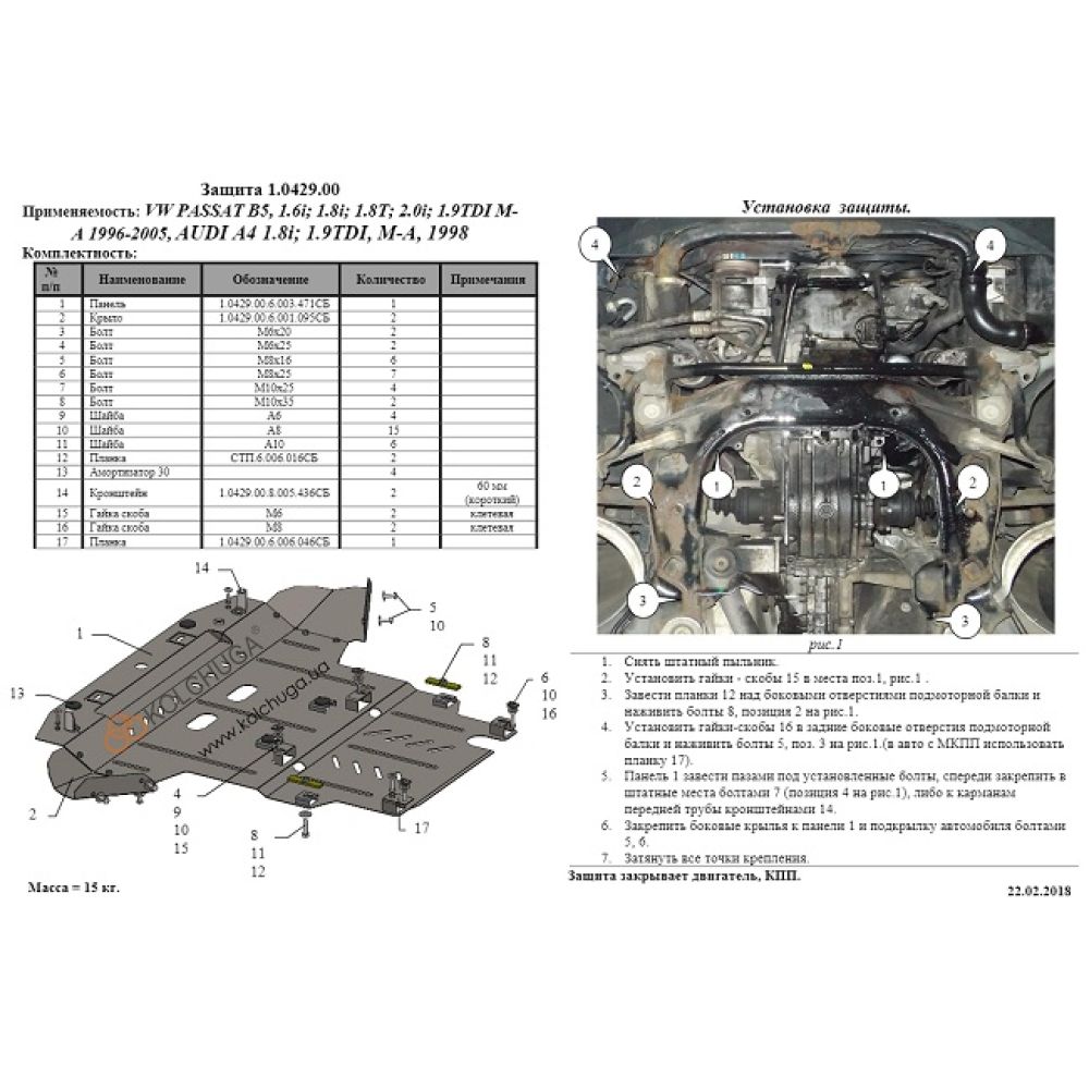 Защита моторного отсека для Volkswagen Passat B5 '97-05, V-1,6i; 1,8i; 1,8T; 2,0i; 1,9TDI, от Украинского производителя Кольчуга. Защита двигателя картера Kolchuga изготавливается из высококачественных материалов, используя холоднокатаную сталь толщиной в 2 мм и с наружи покрыто порошковым напылением, для того чтобы избежать, коррозию металла. Все защиты при производстве покрываются специальным антикоррозийным покрытием. Металлическая защита намного эффективней и прочнее, нежели пластиковая, и более, устойчивей к дорожным условиям ямы, камни, сугробы, вода.