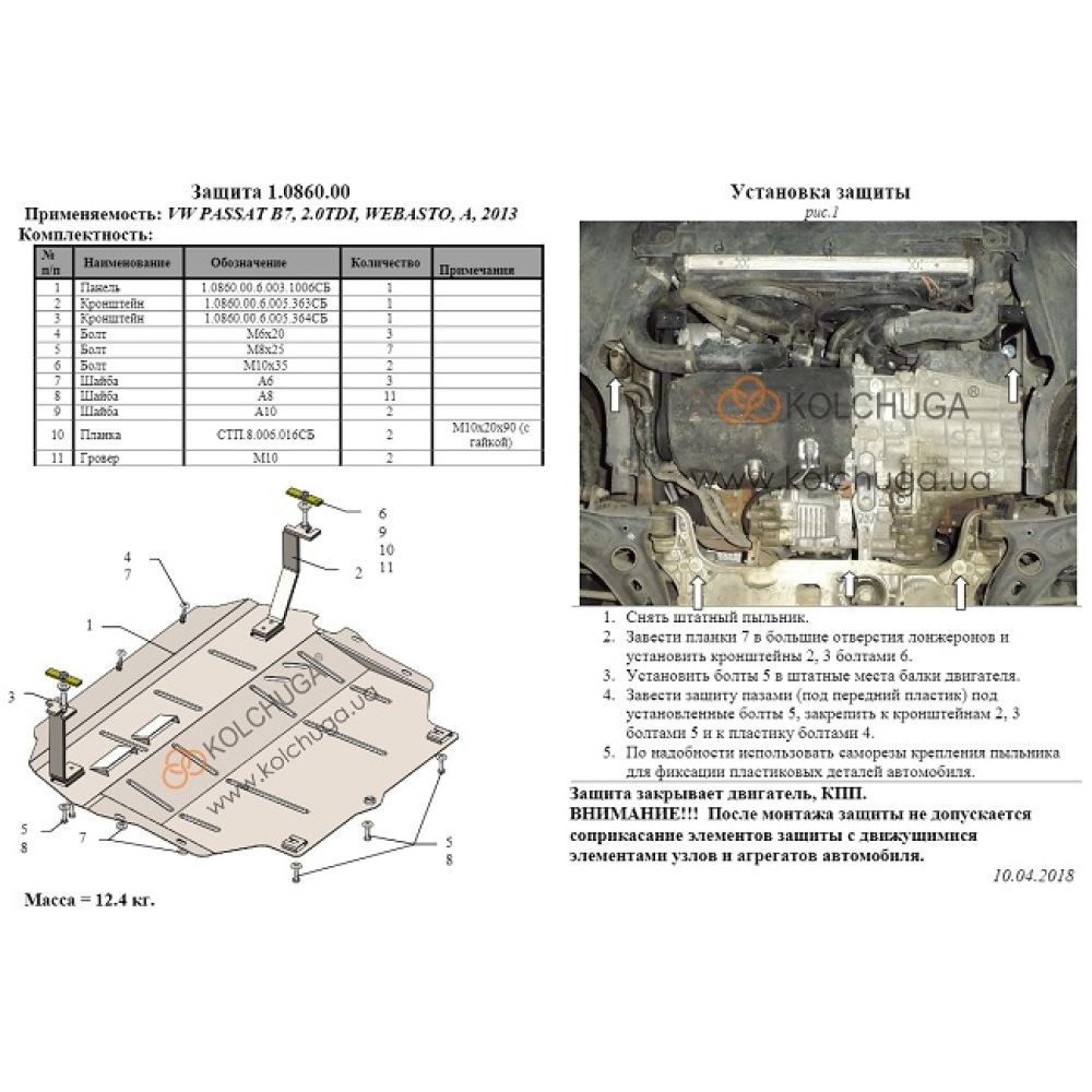 Защита моторного отсека для Volkswagen Passat CC '09-16, V-2.0D; 2.0i, от Украинского производителя Кольчуга. Защита двигателя картера Kolchuga изготавливается из высококачественных материалов, используя холоднокатаную сталь толщиной в 2 мм и с наружи покрыто порошковым напылением, для того чтобы избежать, коррозию металла. Все защиты при производстве покрываются специальным антикоррозийным покрытием. Металлическая защита намного эффективней и прочнее, нежели пластиковая, и более, устойчивей к дорожным условиям ямы, камни, сугробы, вода.
