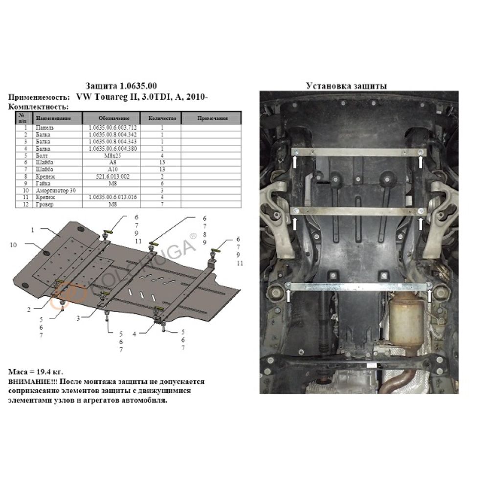 Защита моторного отсека для Volkswagen Touareg '02-, V-2,5TDI; 3,0D, от Украинского производителя Кольчуга. Защита двигателя картера Kolchuga изготавливается из высококачественных материалов, используя холоднокатаную сталь толщиной в 2 мм и с наружи покрыто порошковым напылением, для того чтобы избежать, коррозию металла. Все защиты при производстве покрываются специальным антикоррозийным покрытием. Металлическая защита намного эффективней и прочнее, нежели пластиковая, и более, устойчивей к дорожным условиям ямы, камни, сугробы, вода.