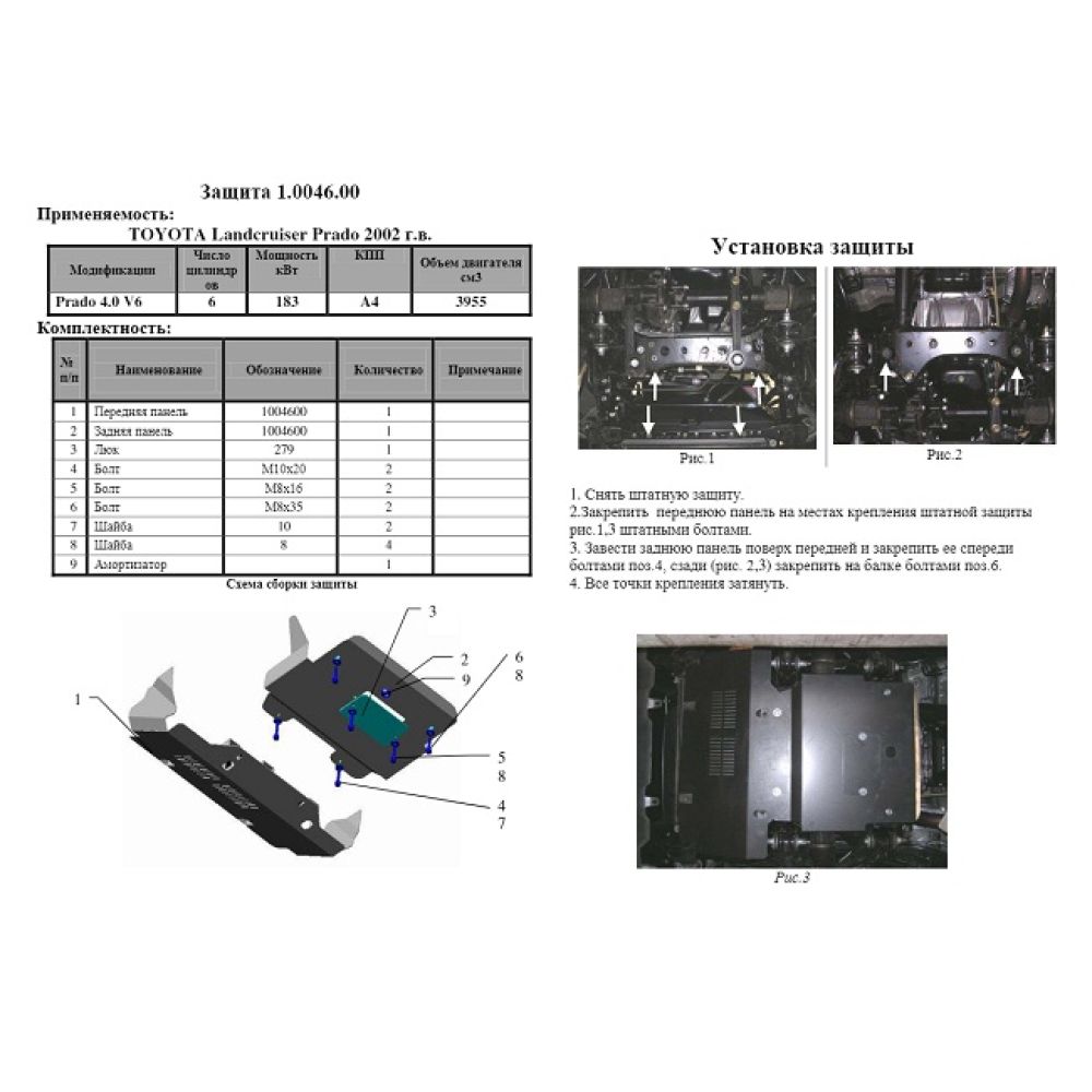 Установка і кріплення - захист двигуна Кольчуга встановлюється в штатні місця на днище автомобіля за допомогою спеціальних кріплень, які йдуть в комплекті і передбачені заводом виробника. В установці не знадобиться додатково допрацьовувати свердлити зварювати і так далі.
