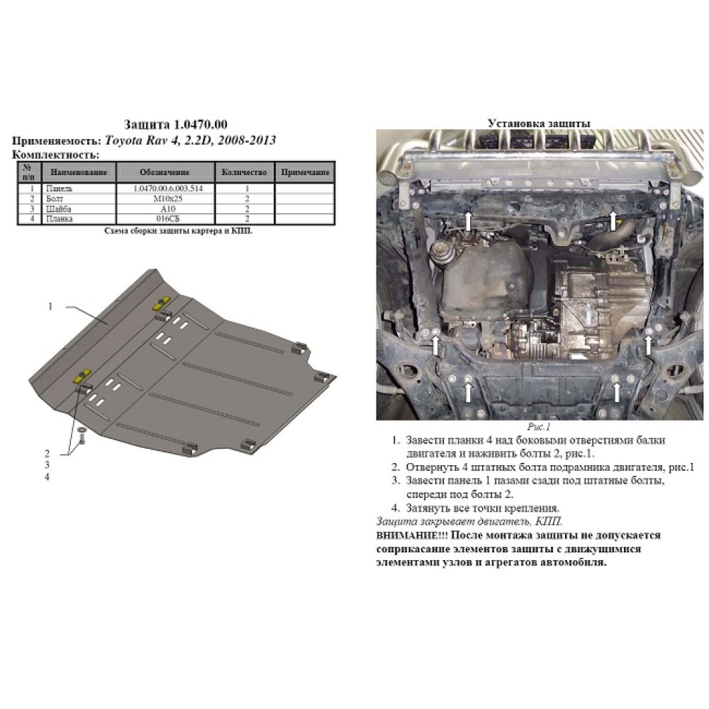 Установка і кріплення - захист двигуна Кольчуга встановлюється в штатні місця на днище автомобіля за допомогою спеціальних кріплень, які йдуть в комплекті і передбачені заводом виробника. В установці не знадобиться додатково допрацьовувати свердлити зварювати і так далі.