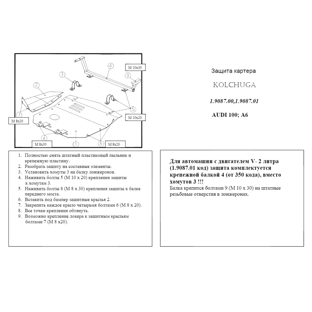 Установка и крепление – защита двигателя Кольчуга устанавливается в штатные места на днище автомобиля с помощью специальных крепежей, которые идут в комплекте и предусмотрены заводом производителя. В установке не понадобится дополнительно дорабатывать сверлить сваривать и так далее.