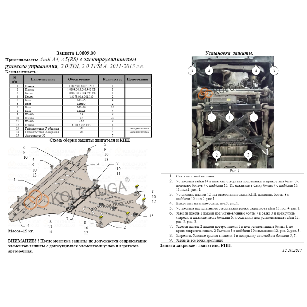 Защита моторного отсека для Audi A4 (B8) '11-15, V-2,0TDI, 2,0TFSI, только электроусилитель, от Украинского производителя Кольчуга. Защита двигателя картера Kolchuga изготавливается из высококачественных материалов, используя холоднокатаную сталь толщиной в 2 мм и с наружи покрыто порошковым напылением, для того чтобы избежать, коррозию металла. Все защиты при производстве покрываются специальным антикоррозийным покрытием. Металлическая защита намного эффективней и прочнее, нежели пластиковая, и более, устойчивей к дорожным условиям ямы, камни, сугробы, вода.