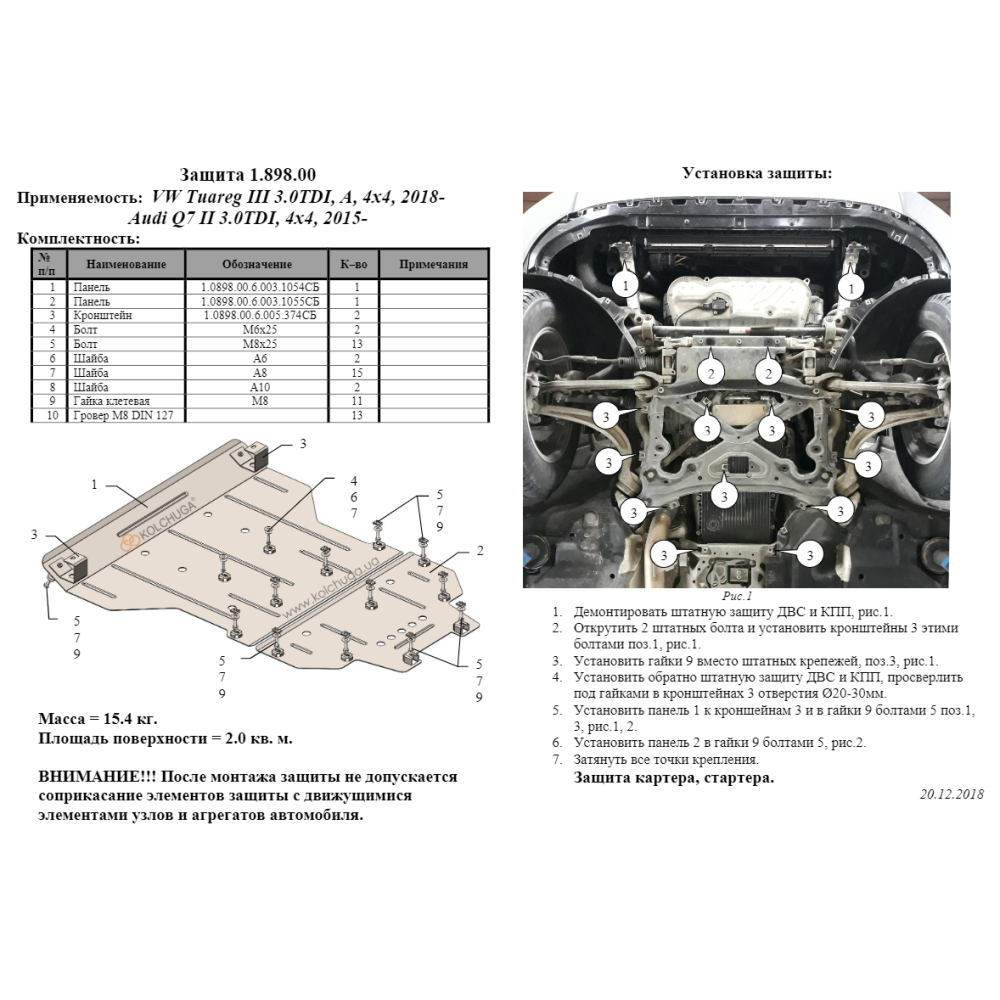 Защита моторного отсека для Audi Q7 '15-, V-3,0TDI, от Украинского производителя Кольчуга. Защита двигателя картера Kolchuga изготавливается из высококачественных материалов, используя холоднокатаную сталь толщиной в 2 мм и с наружи покрыто порошковым напылением, для того чтобы избежать, коррозию металла. Все защиты при производстве покрываются специальным антикоррозийным покрытием. Металлическая защита намного эффективней и прочнее, нежели пластиковая, и более, устойчивей к дорожным условиям ямы, камни, сугробы, вода.