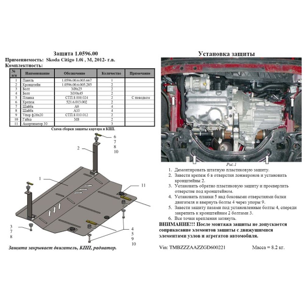 Защита моторного отсека для Skoda CityGo '11-, V-1,0, от Украинского производителя Кольчуга. Защита двигателя картера Kolchuga изготавливается из высококачественных материалов, используя холоднокатаную сталь толщиной в 2 мм и с наружи покрыто порошковым напылением, для того чтобы избежать, коррозию металла. Все защиты при производстве покрываются специальным антикоррозийным покрытием. Металлическая защита намного эффективней и прочнее, нежели пластиковая, и более, устойчивей к дорожным условиям ямы, камни, сугробы, вода.