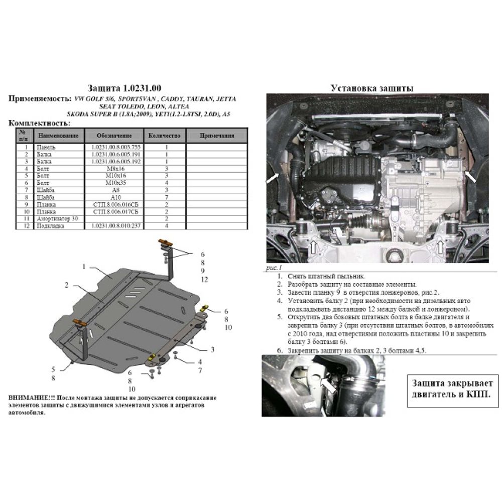 Установка и крепление – защита двигателя Кольчуга устанавливается в штатные места на днище автомобиля с помощью специальных крепежей, которые идут в комплекте и предусмотрены заводом производителя. В установке не понадобится дополнительно дорабатывать сверлить сваривать и так далее.