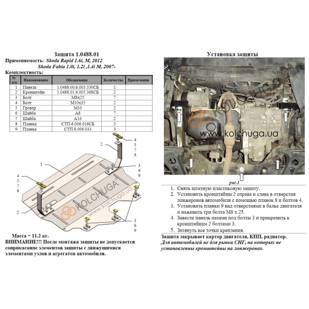 Защита моторного отсека для Skoda Rapid '13-16, V-все, от Украинского производителя Кольчуга. Защита двигателя картера Kolchuga изготавливается из высококачественных материалов, используя холоднокатаную сталь толщиной в 2 мм и с наружи покрыто порошковым напылением, для того чтобы избежать, коррозию металла. Все защиты при производстве покрываются специальным антикоррозийным покрытием. Металлическая защита намного эффективней и прочнее, нежели пластиковая, и более, устойчивей к дорожным условиям ямы, камни, сугробы, вода.