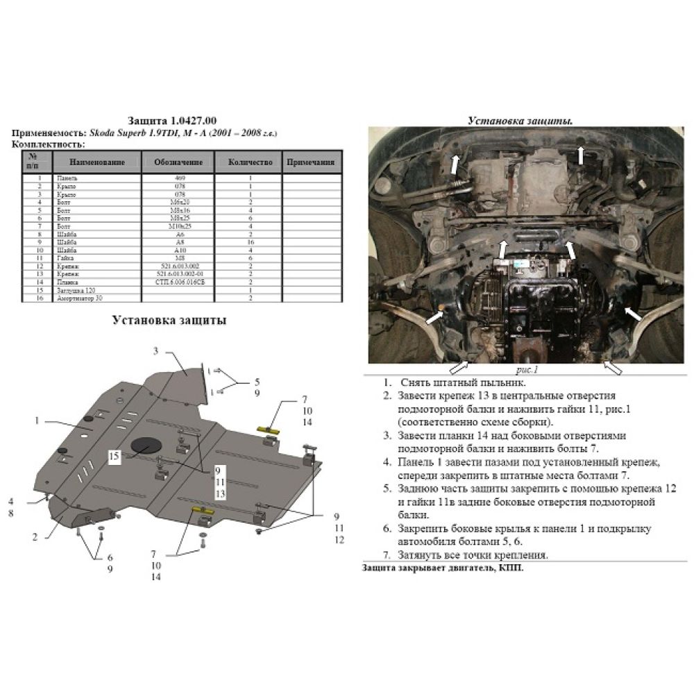 Защита двигателя, радиатора и КПП для Skoda Superb '02-08, V-до 2,0; 2,0D, (Кольчуга)