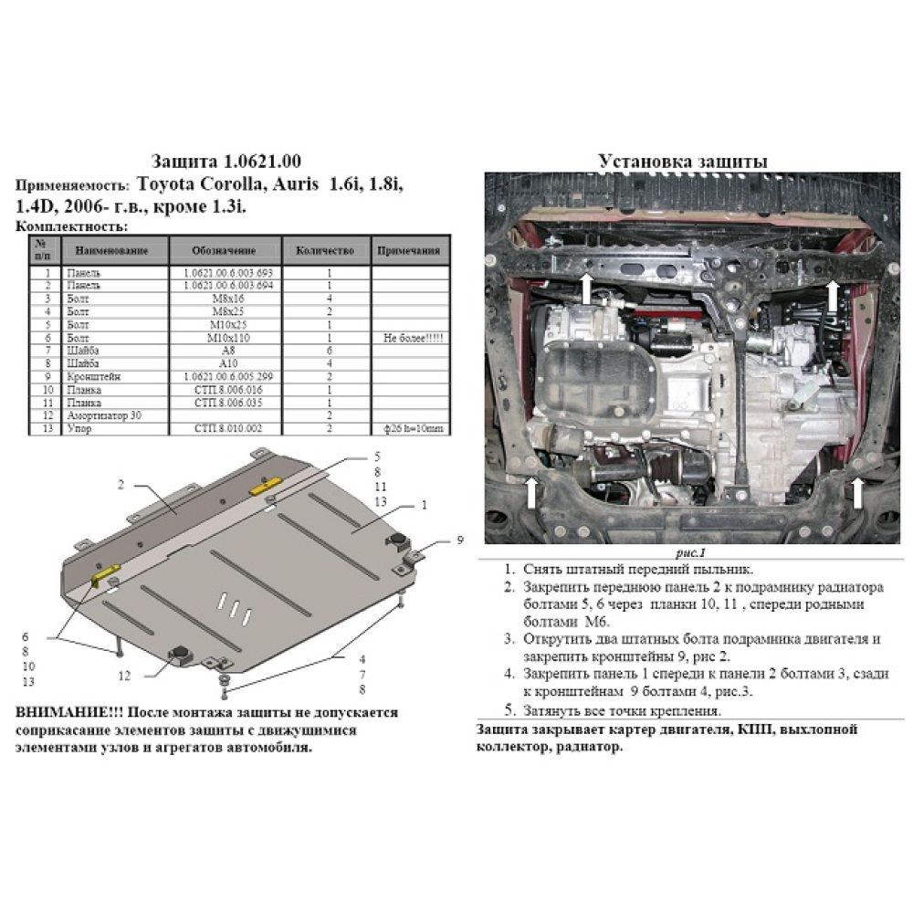 Защита моторного отсека для Toyota Corolla X-XI '06-, V-все, от Украинского производителя Кольчуга. Защита двигателя картера Kolchuga изготавливается из высококачественных материалов, используя холоднокатаную сталь толщиной в 2 мм и с наружи покрыто порошковым напылением, для того чтобы избежать, коррозию металла. Все защиты при производстве покрываются специальным антикоррозийным покрытием. Металлическая защита намного эффективней и прочнее, нежели пластиковая, и более, устойчивей к дорожным условиям ямы, камни, сугробы, вода.