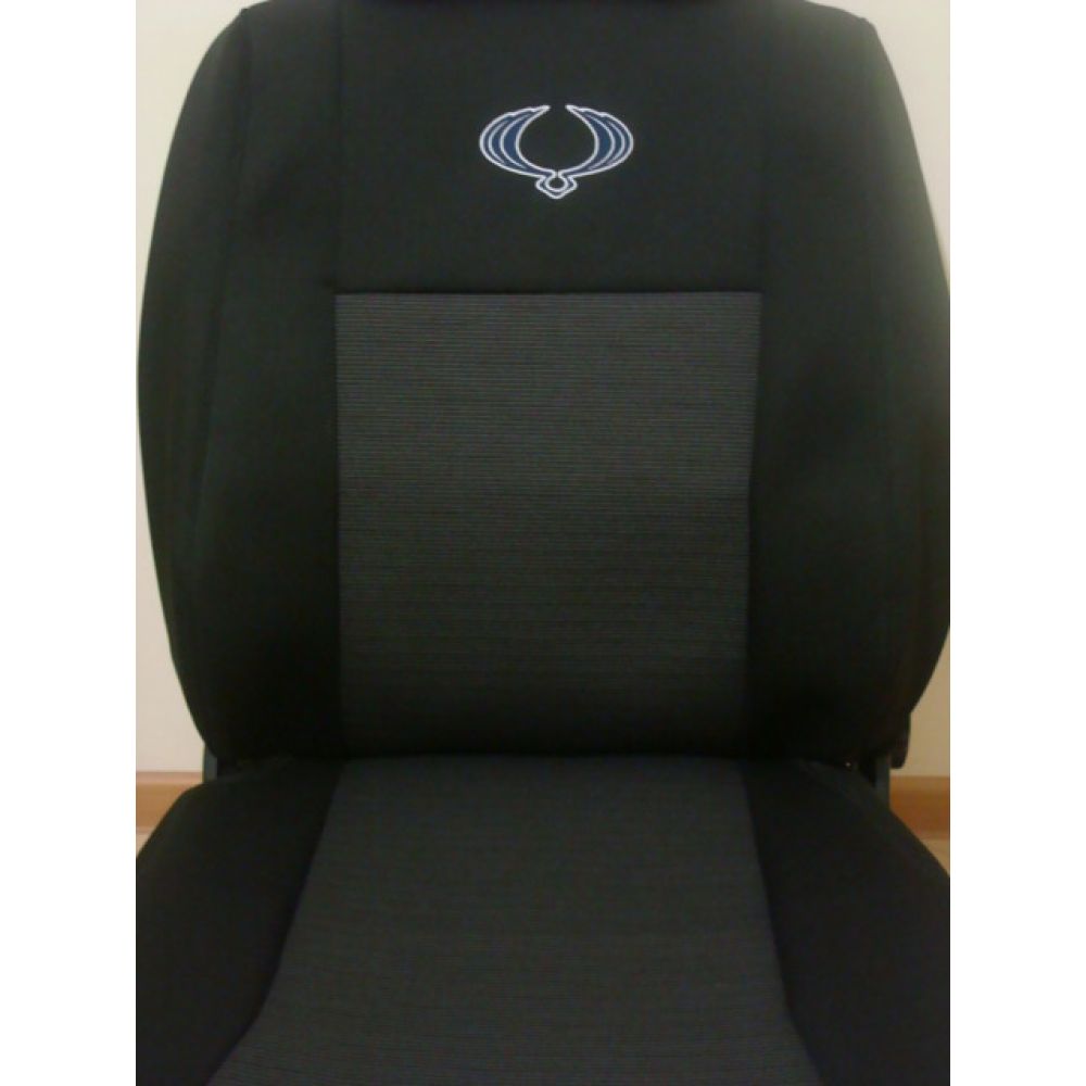 Передние чехлы водительское а также пассажирское с помощью дизайнерского подхода в верхней части вышиты оригинальный логотип вашего автомобиля. Очень важно для удобной установки чехлов имеются оверлочные отверстия под направляющие подголовников.