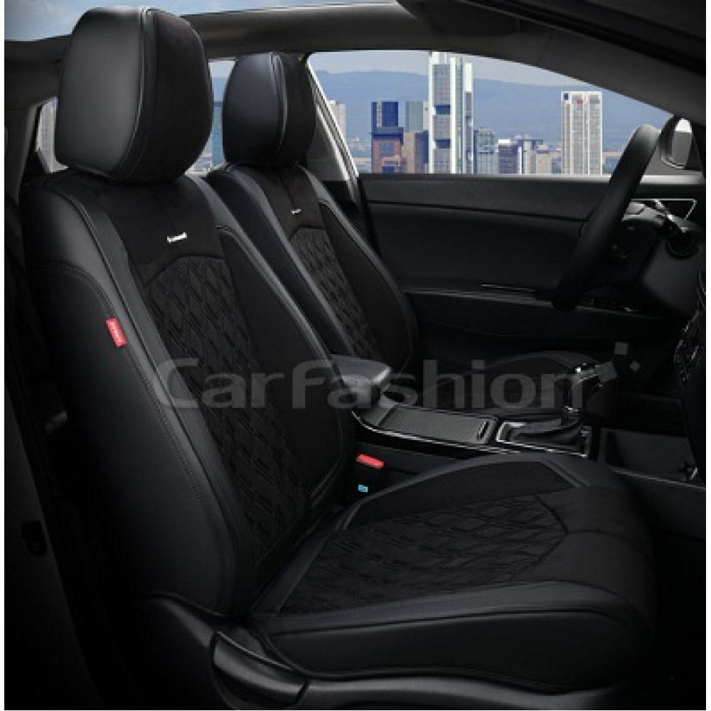 Чехлы на передние сиденья автомобиля CarFashion Diamond front, черный / черный / черный премиум класса изготовлены из высококачественного автомобильного материала искусственная замша плюс экокожа. Благодаря изысканному дизайну каркасных чехлов вы за минуту пере образуете ваш салон в незабываемый вид. Чехлы очень легко и быстро крепятся, и вам не понадобится помощи в установке. Универсальные чехлы CarFashion прекрасно сочетаются как с кожаным салоном, так и с тканевым. У вас есть возможность выбрать любой цвет, который вам максимально подойдет.