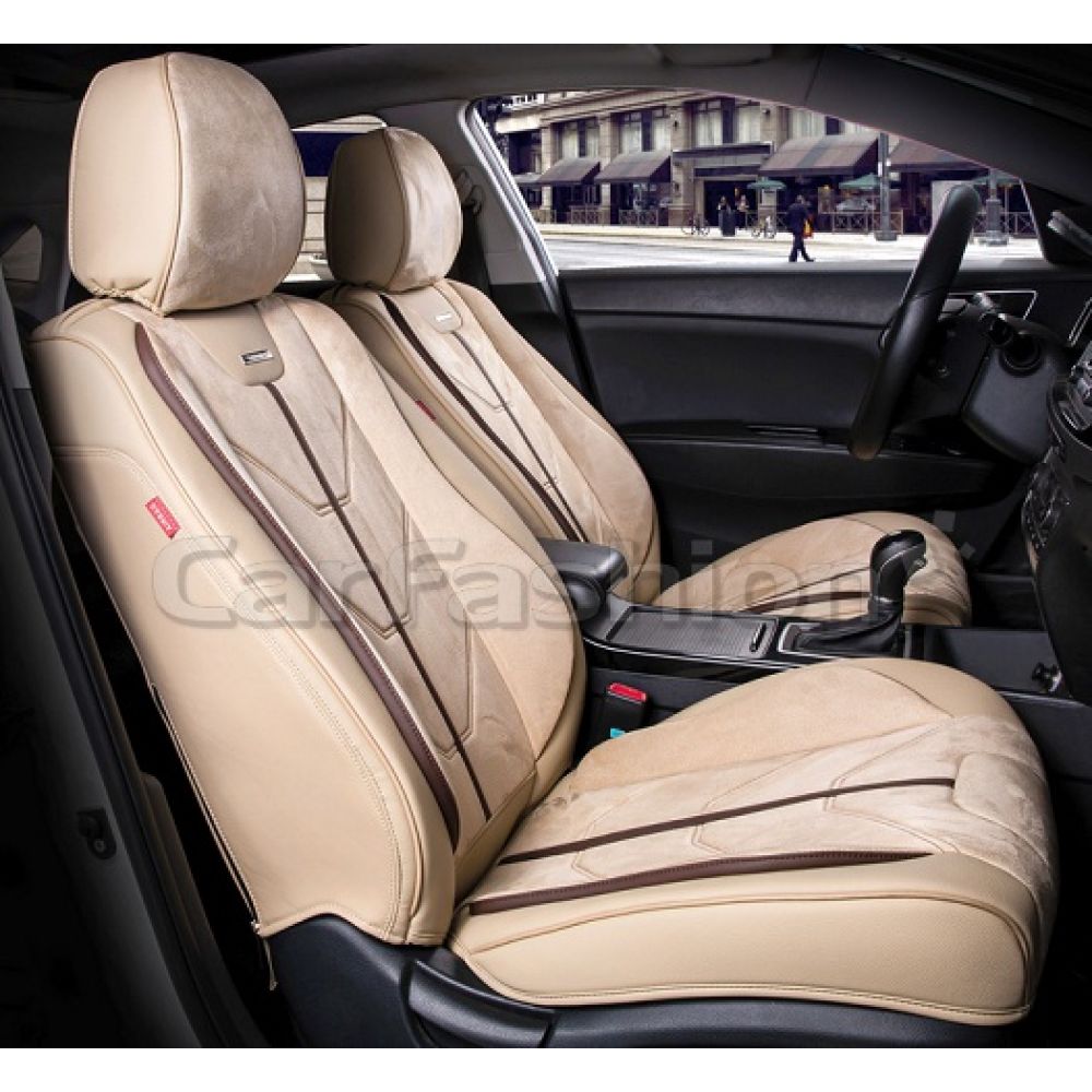 Чехлы на передние сиденья автомобиля CarFashion Start front, бежевый / бежевый / кофе премиум класса изготовлены из высококачественного автомобильного материала искусственная замша плюс экокожа. Благодаря изысканному дизайну каркасных чехлов вы за минуту пере образуете ваш салон в незабываемый вид. Чехлы очень легко и быстро крепятся, и вам не понадобится помощи в установке. Универсальные чехлы CarFashion прекрасно сочетаются как с кожаным салоном, так и с тканевым. У вас есть возможность выбрать любой цвет, который вам максимально подойдет.