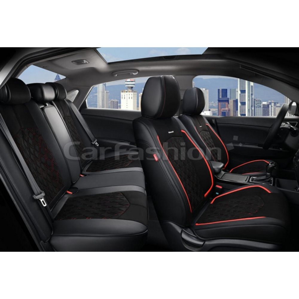 Универсальные чехлы на сиденья автомобиля CarFashion Diamond plus, черный / черный / красный премиум класса изготовлены из высококачественного автомобильного материала искусственная замша плюс экокожа. Благодаря изысканному дизайну каркасных чехлов вы за минуту пере образуете ваш салон в незабываемый вид. Авточехлы очень легко и быстро крепятся, и вам не понадобится помощи в установке. Универсальные чехлы CarFashion прекрасно сочетаются как с кожаным салоном, так и с тканевым. У вас есть возможность выбрать любой цвет, который вам максимально подойдет.