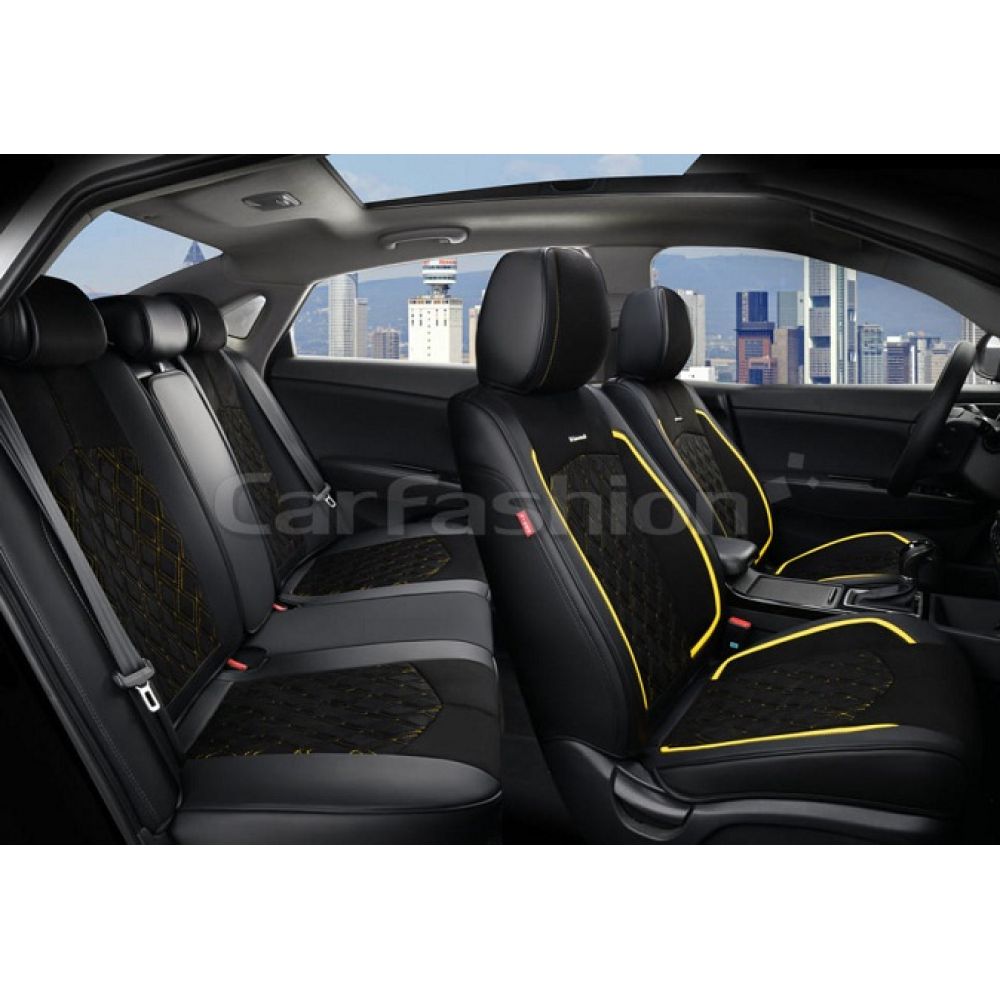 Универсальные чехлы на сиденья автомобиля CarFashion Diamond plus, черный / черный / желтый премиум класса изготовлены из высококачественного автомобильного материала искусственная замша плюс экокожа. Благодаря изысканному дизайну каркасных чехлов вы за минуту пере образуете ваш салон в незабываемый вид. Авточехлы очень легко и быстро крепятся, и вам не понадобится помощи в установке. Универсальные чехлы CarFashion прекрасно сочетаются как с кожаным салоном, так и с тканевым. У вас есть возможность выбрать любой цвет, который вам максимально подойдет.