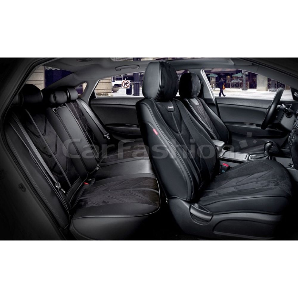Универсальные чехлы на сиденья автомобиля CarFashion Start plus, черный / черный / черный премиум класса изготовлены из высококачественного автомобильного материала искусственная замша плюс экокожа. Благодаря изысканному дизайну каркасных чехлов вы за минуту пере образуете ваш салон в незабываемый вид. Авточехлы очень легко и быстро крепятся, и вам не понадобится помощи в установке. Универсальные чехлы CarFashion прекрасно сочетаются как с кожаным салоном, так и с тканевым. У вас есть возможность выбрать любой цвет, который вам максимально подойдет.