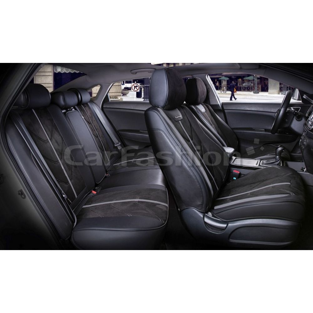 Универсальные чехлы на сиденья автомобиля CarFashion Start plus, черный / черный / темно-серый премиум класса изготовлены из высококачественного автомобильного материала искусственная замша плюс экокожа. Благодаря изысканному дизайну каркасных чехлов вы за минуту пере образуете ваш салон в незабываемый вид. Авточехлы очень легко и быстро крепятся, и вам не понадобится помощи в установке. Универсальные чехлы CarFashion прекрасно сочетаются как с кожаным салоном, так и с тканевым. У вас есть возможность выбрать любой цвет, который вам максимально подойдет.