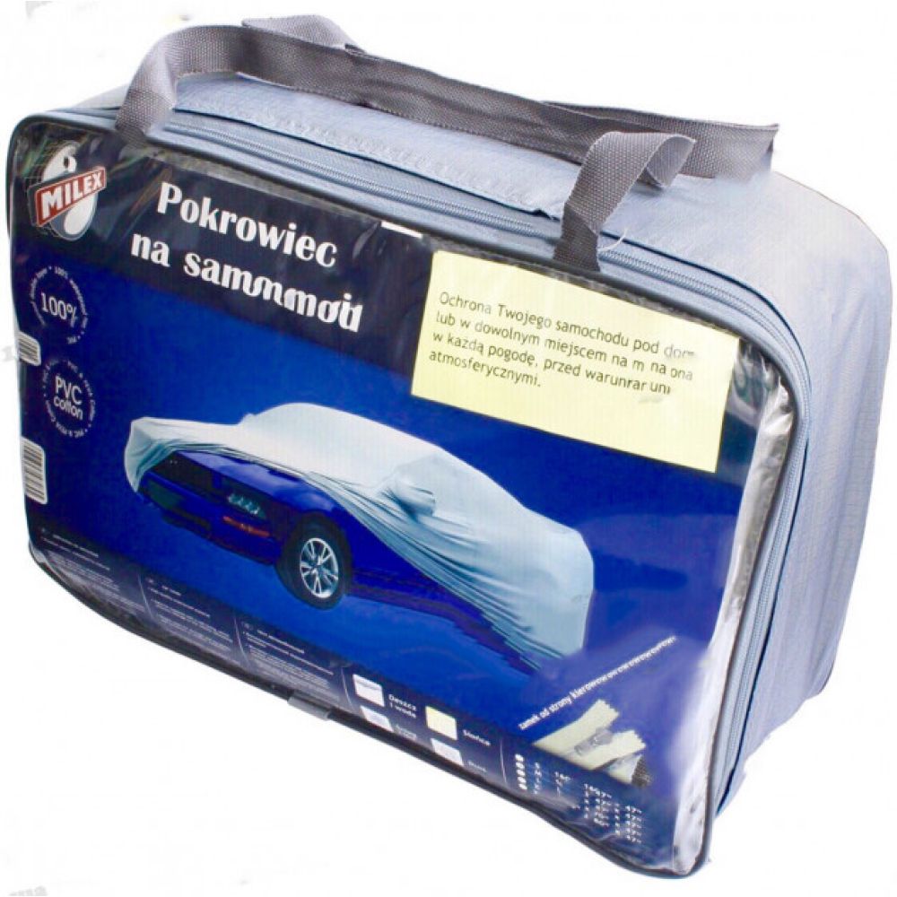 Тент для автомобіля седан "M" Milex PEVA + PP Cotton виготовлений з міцної водовідштовхувальним прогумованої тканини PEVA, нижня частина тенту повстяна підкладка, м'яка внутрішня частина захищає лакофарбову поверхню вашого автомобіля від потертості і подряпин, а так само від намерзання взимку і перегрівання влітку. Ідеальне виконання за допомогою високих технологій тент чітко повторює контури автомобіля. Сріблястий колір тканини захистить кузов автомобіля від прямих сонячних променів, бруду, пилу, води, листя і інших природних явищ. Тент прошитий подвійним рядком акриловими нитками що в рази підвищує його довговічність.